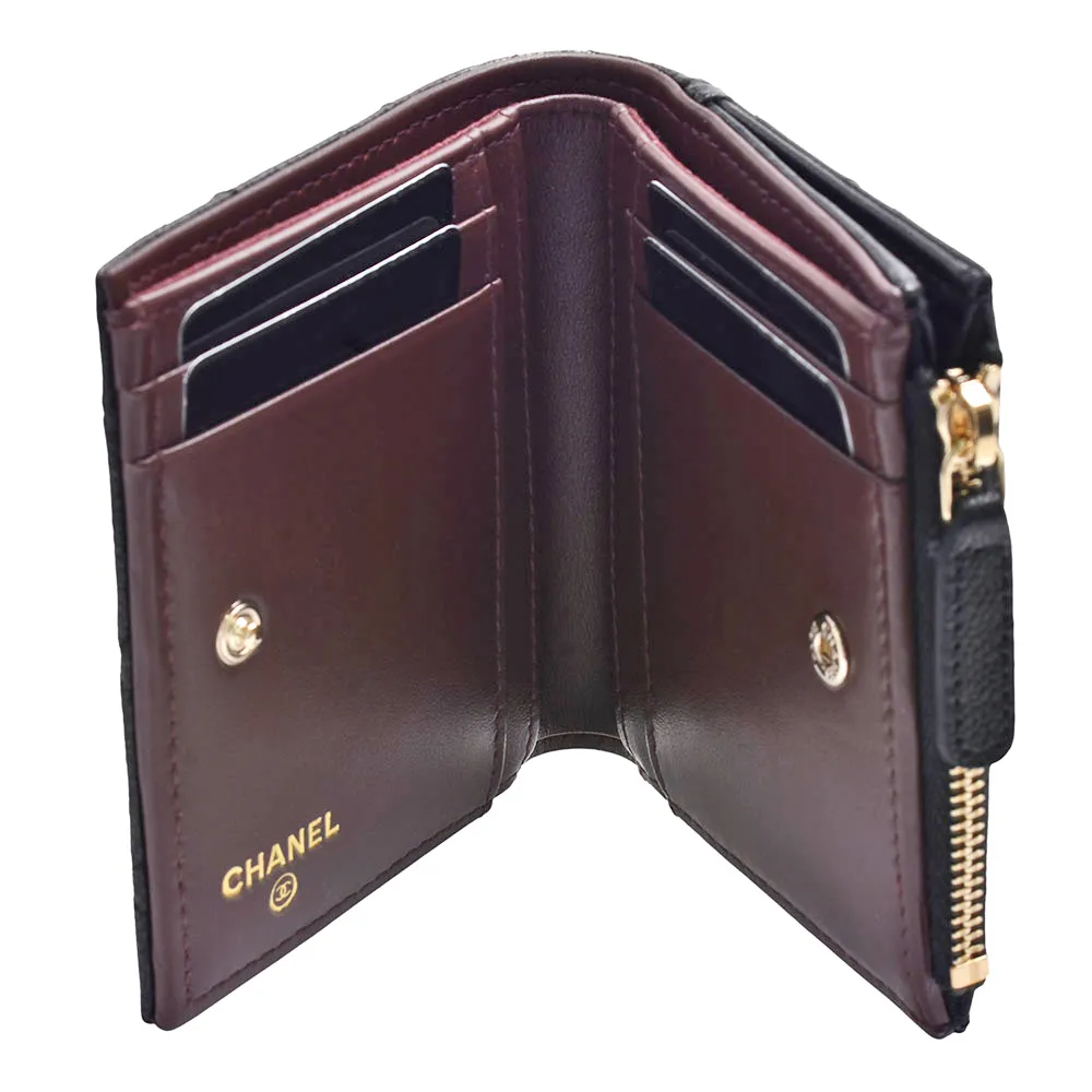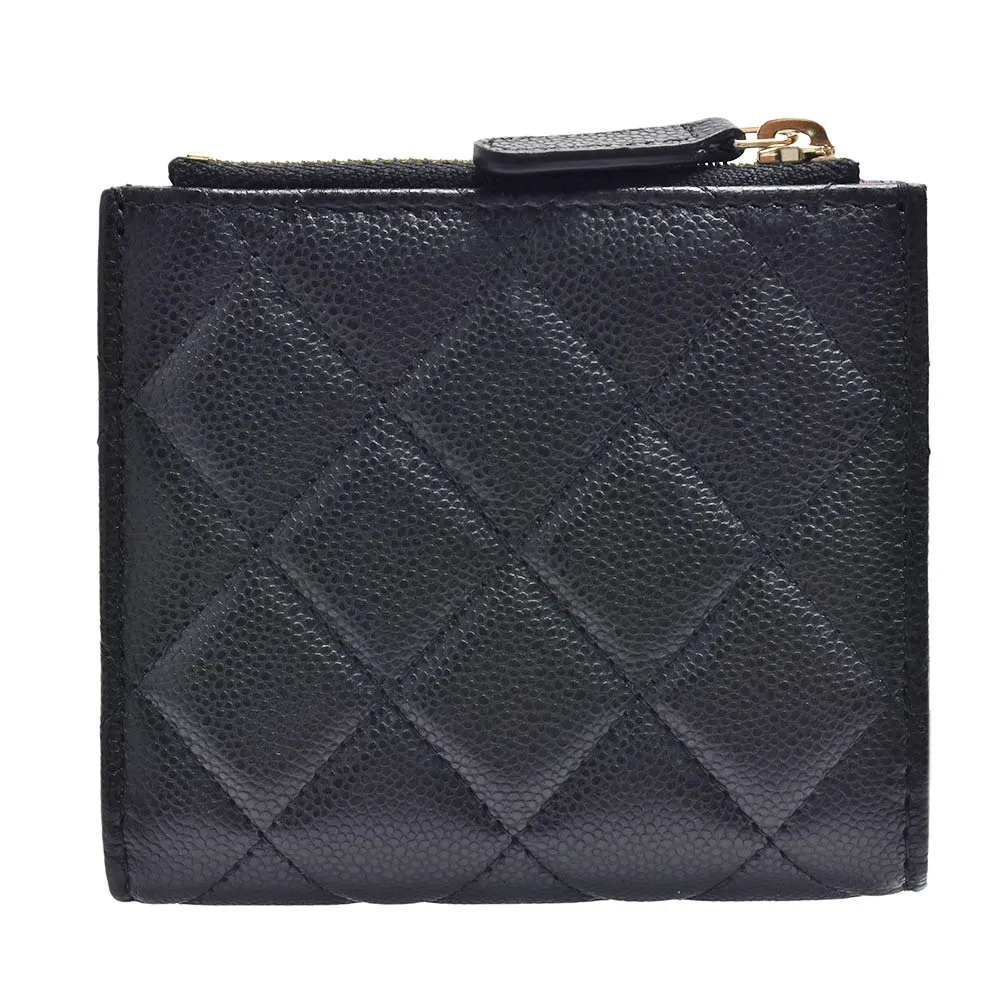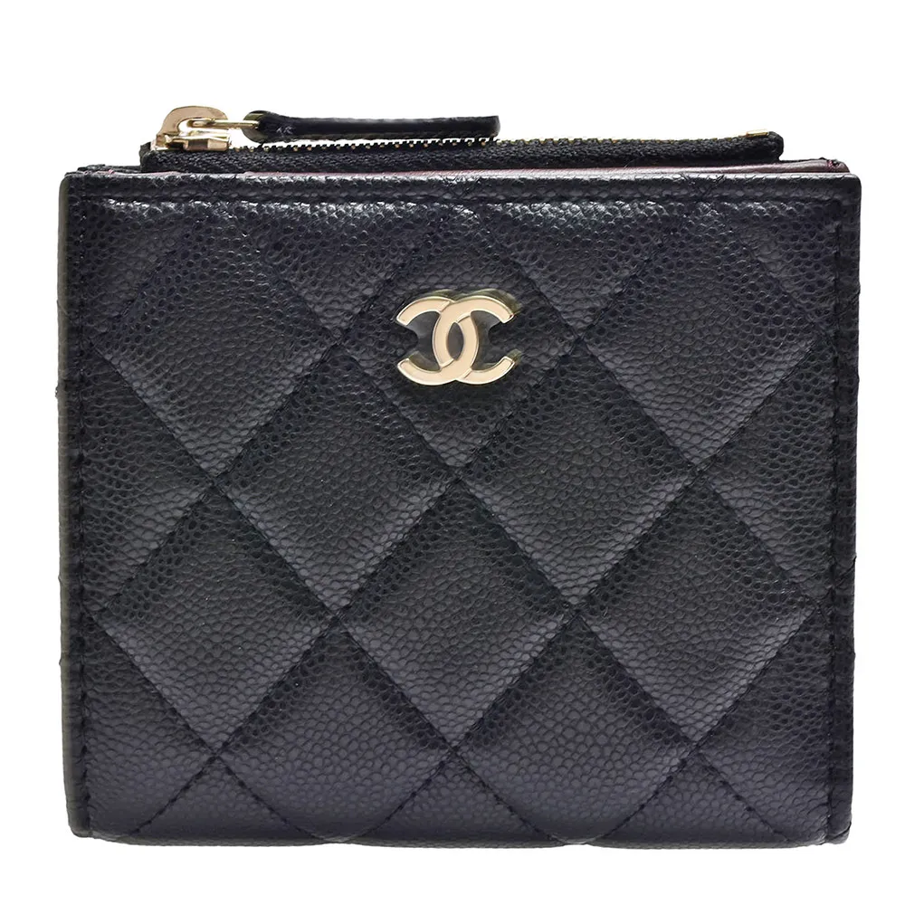 CHANEL 香奈兒 經典金色雙C LOGO菱格紋 荔枝牛皮 暗釦短夾 皮夾