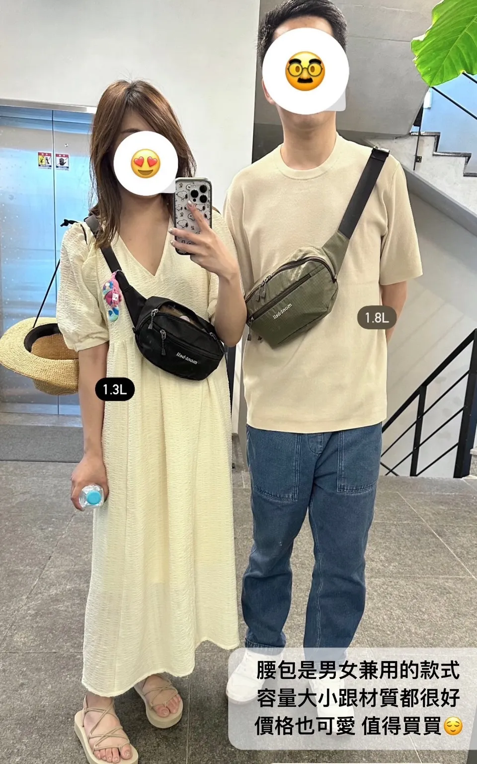 有迷有人跟我有一樣的困擾~~ 很多好看的腰包 背起來對女生來說 還是太大顆 這顆完全不會耶 有兩種尺寸 我揹起來都很喜歡~~已包款 質感也是讚讚的 男女生都可以買起來🤩 ➡️尺寸: 1.3L 約13x20x7cm 可放短夾 1.8L 約15x24x8cm 可放長夾兩個包款沒甚麼差異 容量大小跟肩帶粗細不同而已