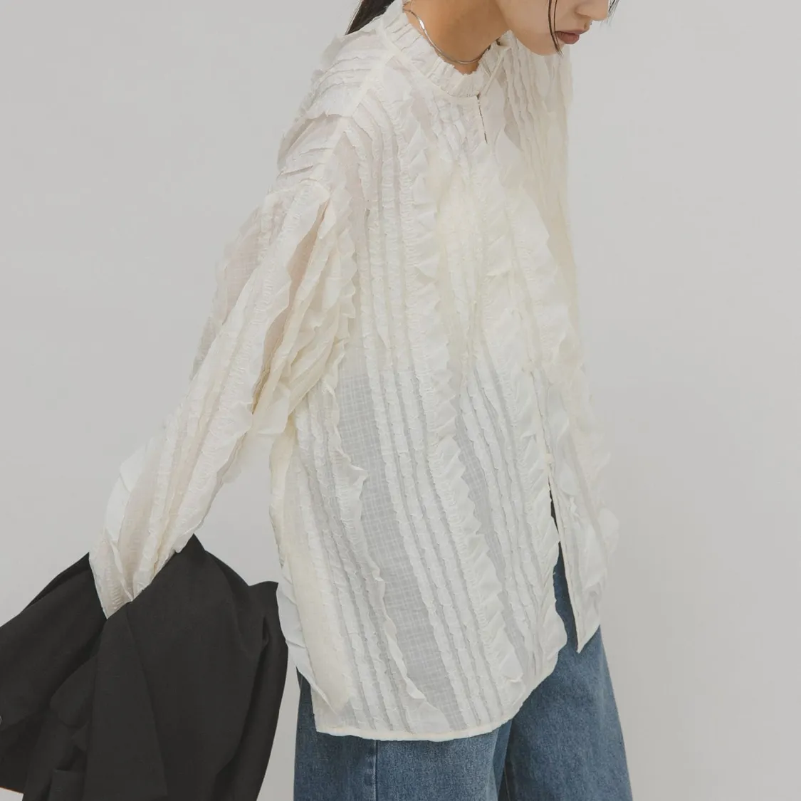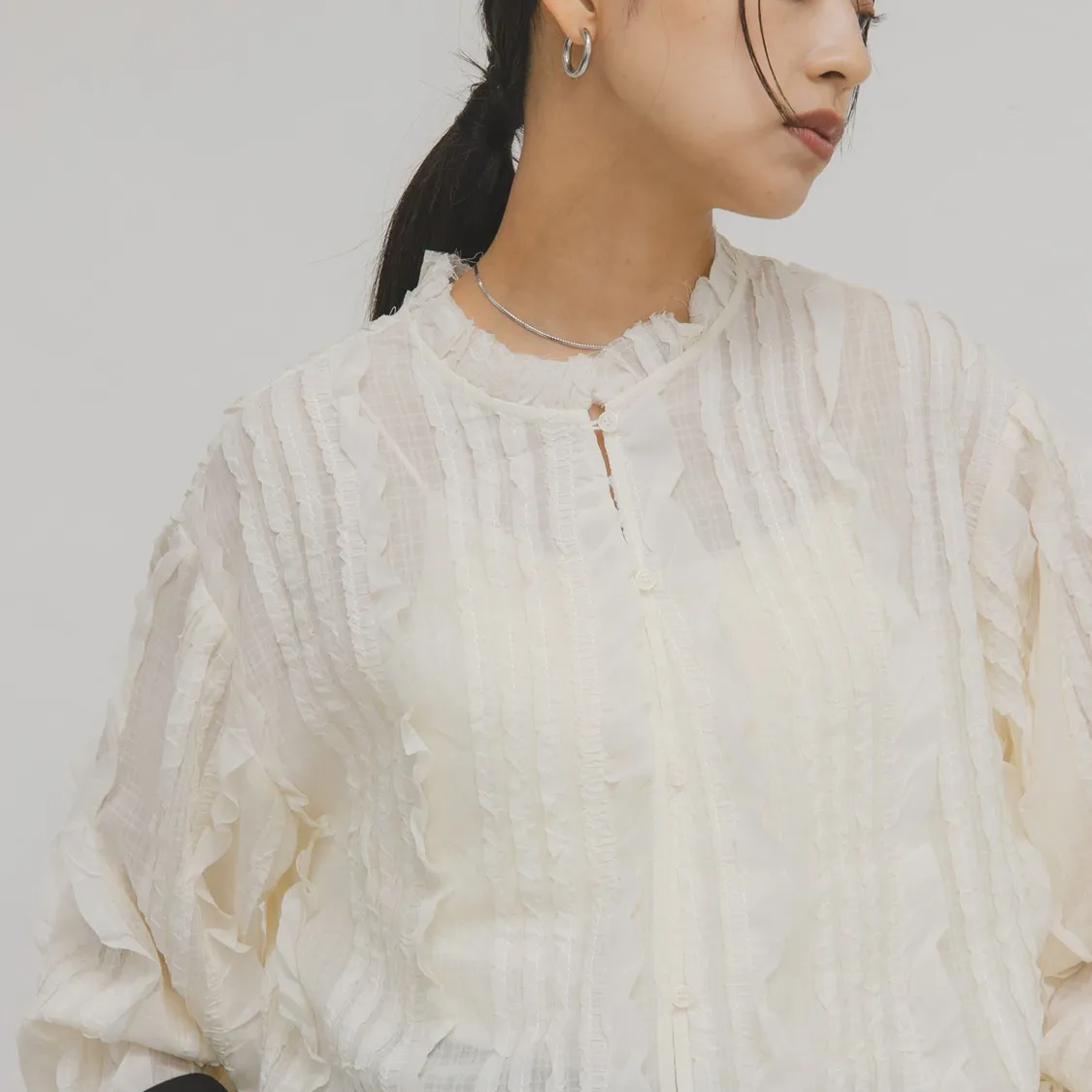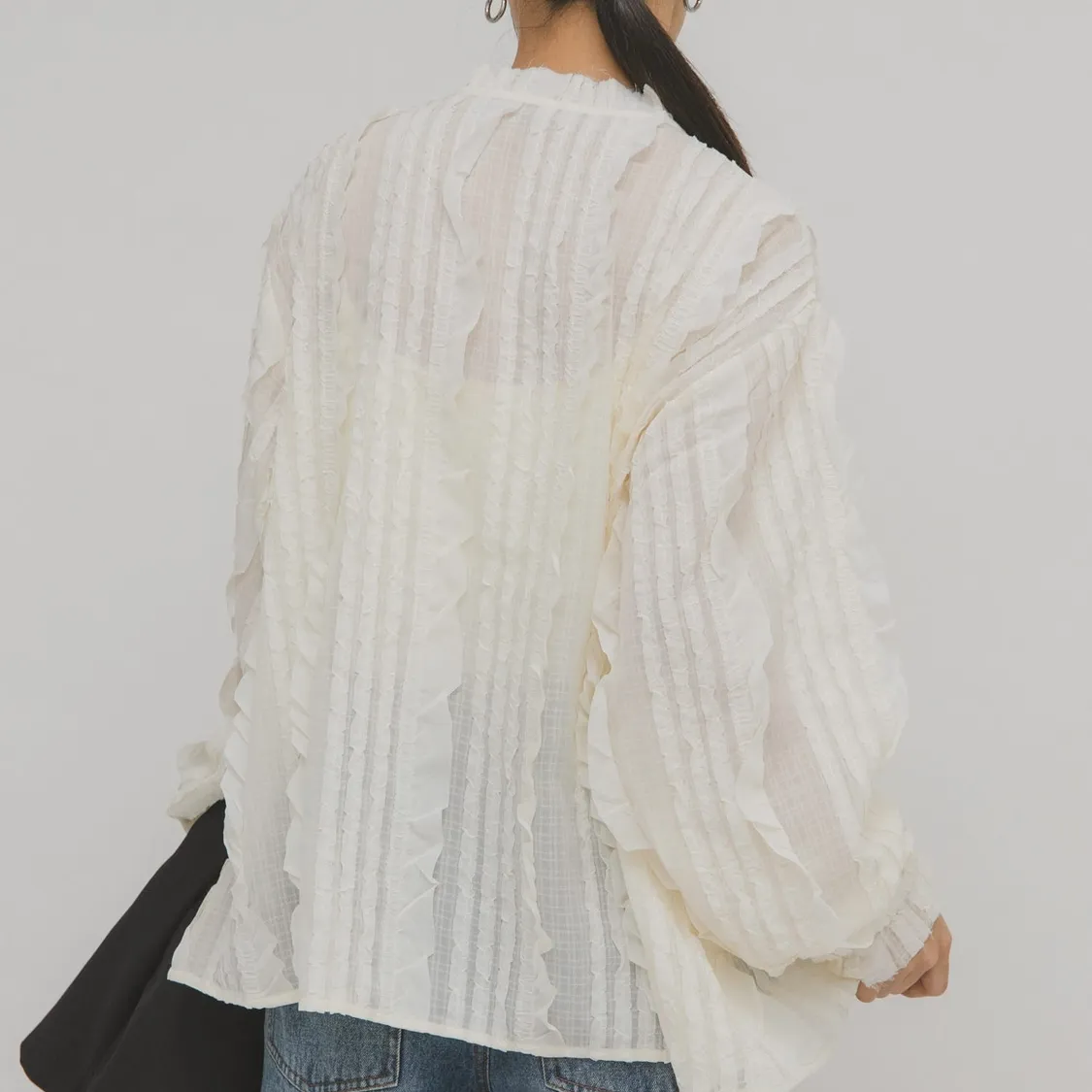 這款襯衫採用醒目的立體小荷葉邊設計,搭配簡潔的版型