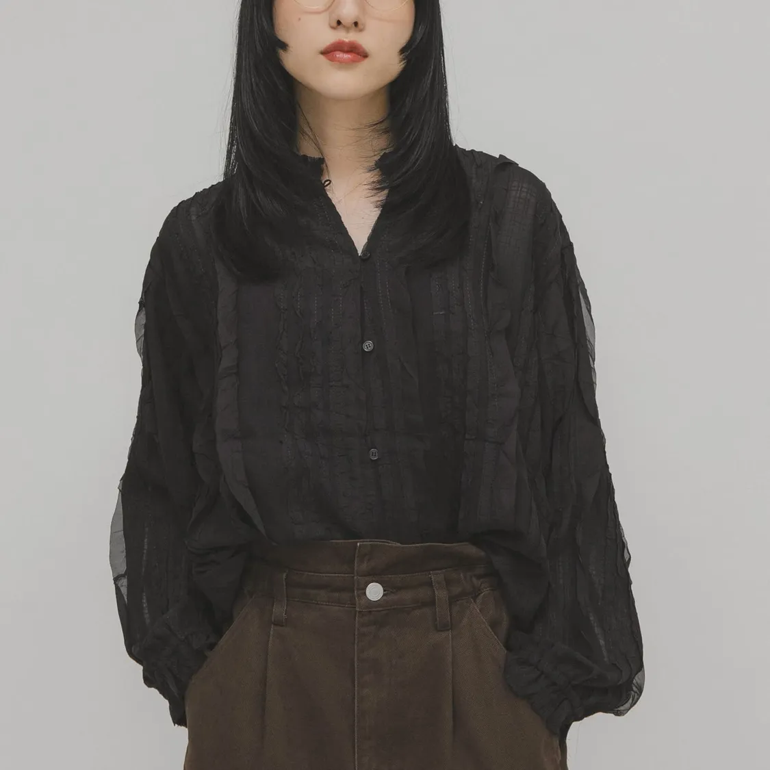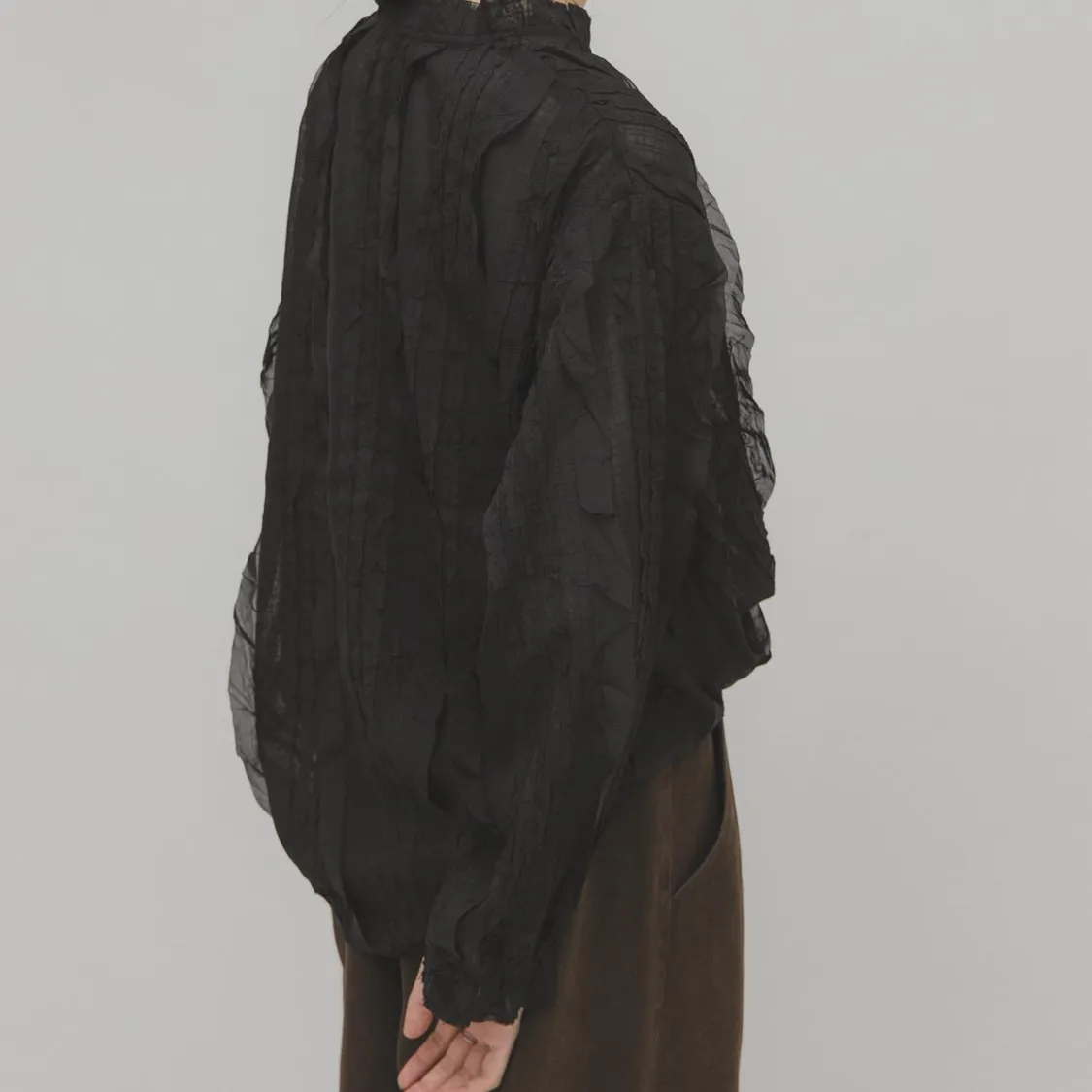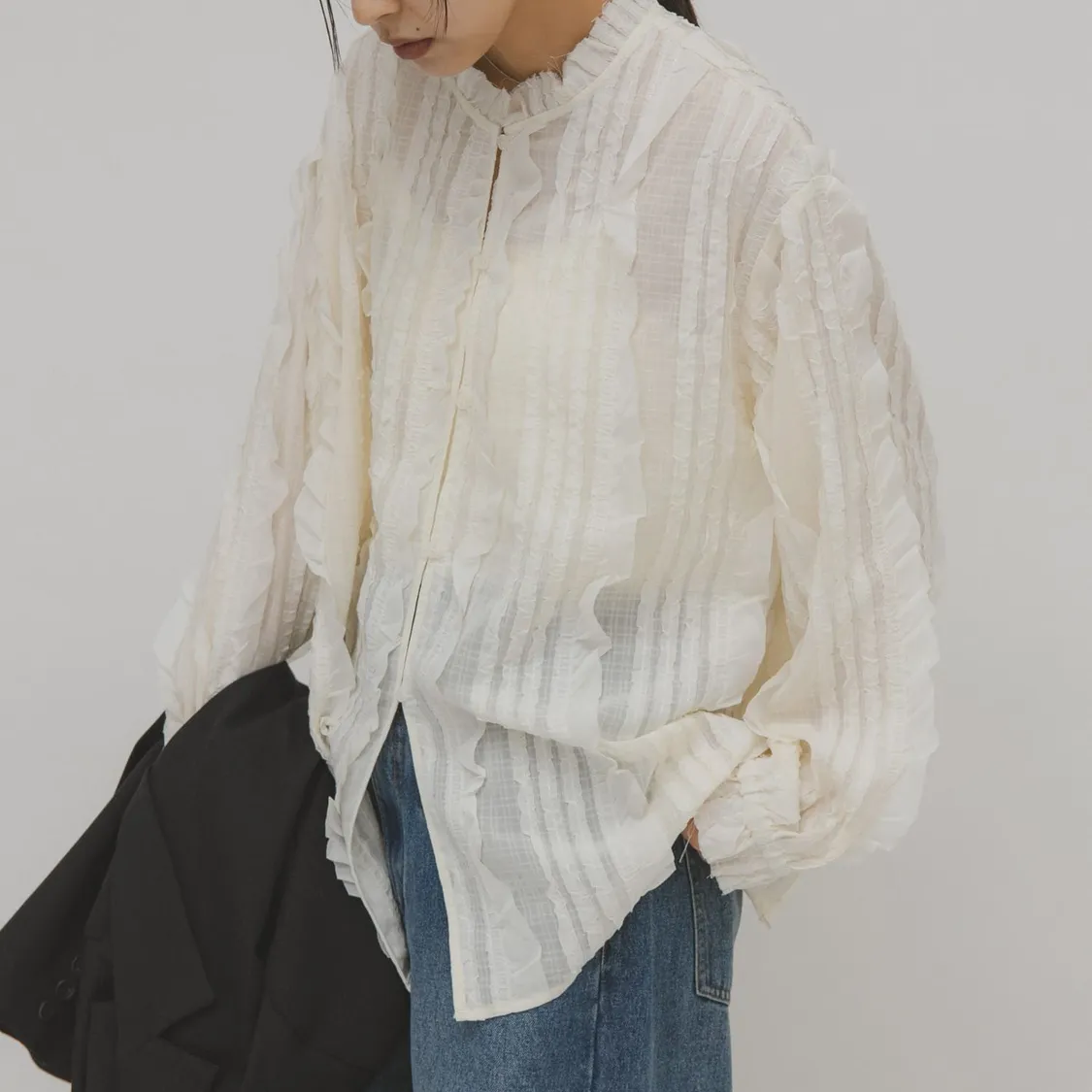 這款襯衫採用醒目的立體小荷葉邊設計,搭配簡潔的版型